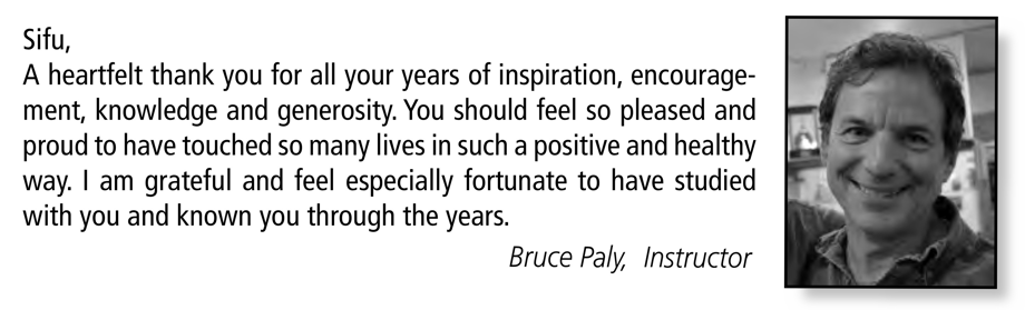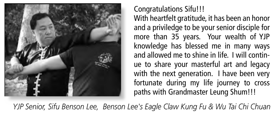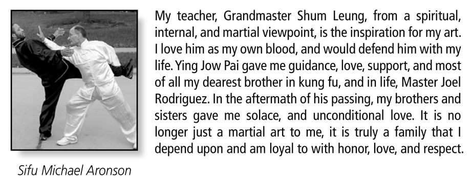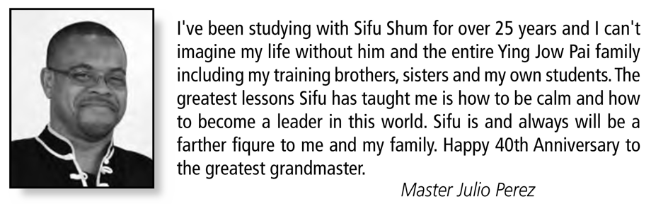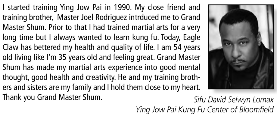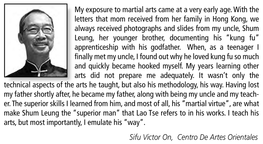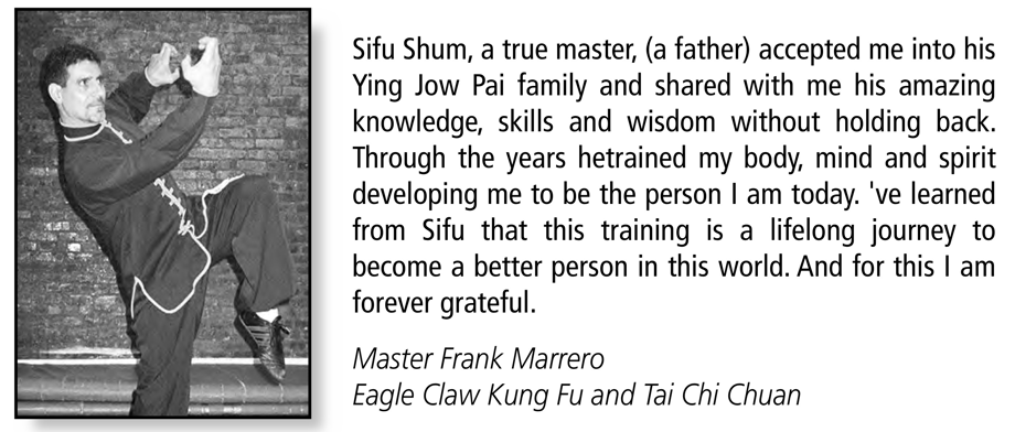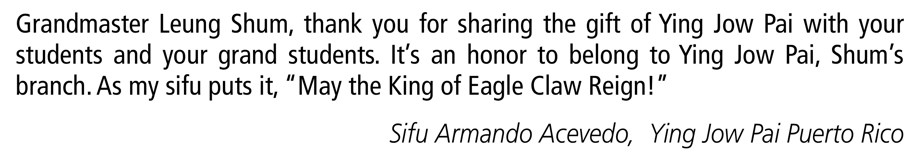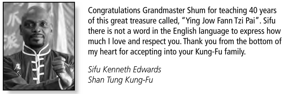 When I first met Sifu Leung Shum in 1980, I was honored to be in the presence of an "old school" martial arts master. Sifu always demonstrated that maintaining the tradition was more important than commercialism. Sifu Shum's commitment to his students and his willingness to share the depth and secrets of the art distinguished him from other teachers.