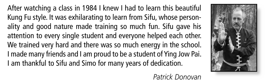 Like most people my age, I'd secretly wanted to learn martial arts ever since I was a kid and I watched Kung Fu on TV and Karate Kid in the movie theaters. When I finally decided to do it, I chose Ying Jow Pai for a couple of reasons. One reason is that the class I saw was intense. What passes for warm-up here would have been the whole class at another school. The second and most important reason is that the teachers were accessible and down-to-earth, and everyone got individual attention. At other schools, I saw students teaching students, but at Ying Jow Pai, everyone learns directly from the master.